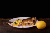 Grillowanej ryby z ziołami i cytryną, na podłoże drewniane, widok z góry. Koncepcja śródziemnomorskie owoce morza luksusowe