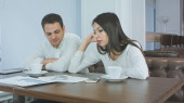 Dwaj koledzy office, omawiając pracę i uśmiechając się siedząc w kawiarni
