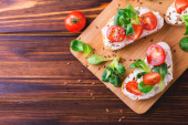 Kanapka z łososiem i sałatkę liści. Na tle drewnianych. Widok z góry. Miejsce.