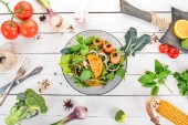 Sałatka szpinaku i przepiórczych jaj na tle drewnianych. Zdrowe jedzenie. Widok z góry. Miejsce.