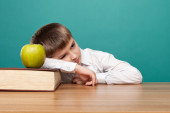 Powrót do koncepcji szkoły. Szkoła dziecka (chłopca) w klasie. Zabawne dziecko przeciwko zielona tablica... Koncepcja idei i kreatywność. Lato na tle tablica