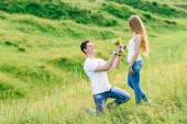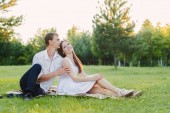 Młoda para stojących blisko siebie trzymając wina i muffin w swoje ręce