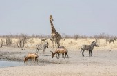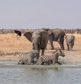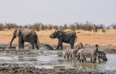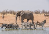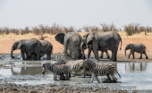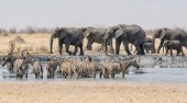 stado słoni afrykańskich przy wodopoju w sawanny Namibii