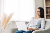 Zdjęcie "Portret kobiety uśmiechający się za pomocą laptopa, siedzi na kanapie w domu" może być wykorzystywane do celów osobistych i komercyjnych zgodnie z warunkami zakupionej licencji Royalty-free. Obraz jest dostępny do pobrania w jakości wysokiej rozdzielczości do 5760x3840.