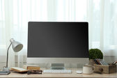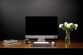 Zamknij widok graficzny projektant miejsca pracy z tabletem graficznym, pusty ekran komputera, Notebooki i filiżankę kawy na drewnianym blatem