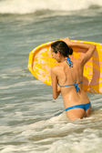 Młoda kobieta w mokrej koszuli białych pozowanie w morze