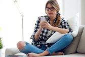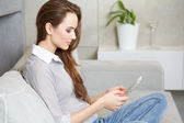 Portret młodej kobiety na czacie z inteligentny telefon na kanapie w domu