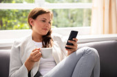 Zdjęcie "Portret młodej kobiety na czacie z inteligentny telefon na kanapie w domu" może być wykorzystywane do celów osobistych i komercyjnych zgodnie z warunkami zakupionej licencji Royalty-free. Obraz jest dostępny do pobrania w jakości wysokiej rozdzielczości do 5760x3840.