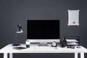 Zdjęcie "Zamknij widok graficzny projektant miejsca pracy z kolorowych palet, tablet graficzny, pusty ekran komputera i lampa na powierzchni drewnianych" może być wykorzystywane do celów osobistych i komercyjnych zgodnie z warunkami zakupionej licencji Royalty-free. Obraz jest dostępny do pobrania w jakości wysokiej rozdzielczości do 5760x3840.