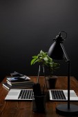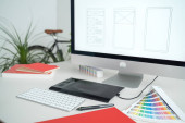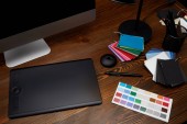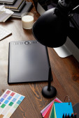 Zamknij widok graficzny projektant miejsca pracy z kolorowych palet, tablet graficzny, pusty ekran komputera i lampa na powierzchni drewnianych