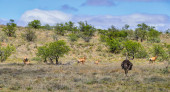 Trzy kobiety antylopy Kudu stojąc w południowej afrykańskiej sawanny