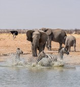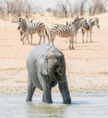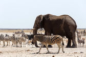 Słoń goni Zebra przy wodopoju w sawanny Namibii