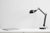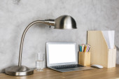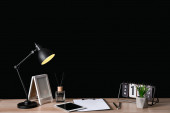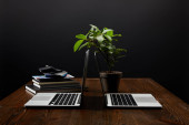 zbliżenie pracy projektanta z laptopów, notebooków i palet na drewnianym blatem na tle czarna ściana