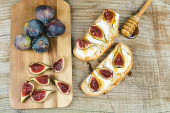 Kanapki z figami, ricotta, miodu i tymianek na szarym tle. od góry