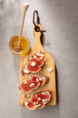 Kanapki z figami, ricotta, miodu i tymianek na szarym tle. od góry