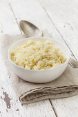 świeże domowe sery w misce, Dzbanek mleka na białym tle drewnianych