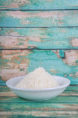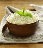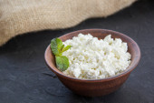 świeże domowe sery w misce, Dzbanek mleka na niebieskim tle drewnianych