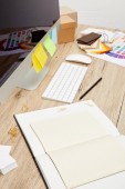 Zamknij widok laptop, tablet graficzny, notebooków i palet na powierzchni drewnianych w pracy projektant graficzny