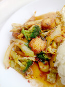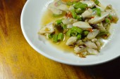 Pikantna zupa Yum Tom w biały cios z ziela, pikantna zupa jasne typowe w Tajlandii i nr 1 danie kuchni tajskiej, gorąco i Żurek. Popularne dania kuchni tajskiej, tradycyjne potrawy kuchni w Tajlandii,