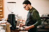 Młody barista w okulary i cap stojąc przy barze licznik i przygotowanie wlać przy kawie, podczas pracy w kawiarni