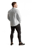 młody człowiek w płótna, pozowanie na białym tle na szarym tle