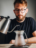 Portret młodego barista stojąc przy barze licznik i pachnące wlać przy kawie patrząc sennie w aparacie w kawiarni