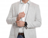 przycięte zdjęcie intymność lnianej koszuli biały model mężczyzna na białym tle na szarym tle