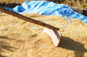 Surowe płatki owsiane i drewnianą łyżką. Najlepsze ziarna na śniadanie.