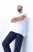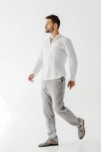 Widok z boku miło człowieka w lniane ubrania, siedział na krześle na białym tle na szarym tle