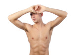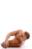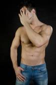 Młody przystojny mężczyzna jest w stanie spoczynku. Półnagi facet siedzi na podłodze. Mięśni i sexy. Szare tło