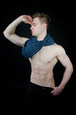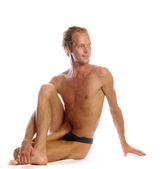 Młody przystojny mężczyzna jest w stanie spoczynku. Półnagi facet siedzi na podłodze. Mięśni i sexy. Szare tło