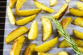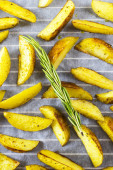 Pieczone ziemniaki na blachy do pieczenia z kawałki przypraw i rozmaryn. W domu, gotowanie w kuchni