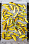 Zdjęcie "Pieczone ziemniaki na blachy do pieczenia z kawałki przypraw i rozmaryn. W domu, gotowanie w kuchni" może być wykorzystywane do celów osobistych i komercyjnych zgodnie z warunkami zakupionej licencji Royalty-free. Obraz jest dostępny do pobrania w jakości wysokiej rozdzielczości do 5760x3840.