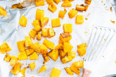 Zdjęcie "Pieczone ziemniaki na blachy do pieczenia z kawałki przypraw i rozmaryn. Podłoże. Widok z góry, płaskie świeckich" może być wykorzystywane do celów osobistych i komercyjnych zgodnie z warunkami zakupionej licencji Royalty-free. Obraz jest dostępny do pobrania w jakości wysokiej rozdzielczości do 5760x3840.