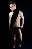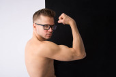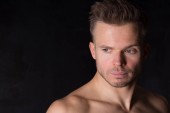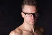 Młody przystojny mężczyzna jest w stanie spoczynku. Smart, mięśni i sexy. Kontrast tła
