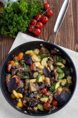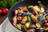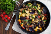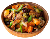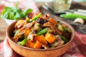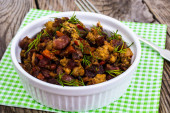 Palona butternut squash z brukselki i boczek w ceramiczne płytki rustykalne drewniane płyty