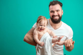 Figlarny ojca, niosąc jego uśmiechający się niemowlę dziecko na szyi na niebieskim tle
