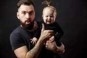 Ojciec trzymający w ręce słodkie małe dziecko. Koncepcja rodziny, miłości i szczęścia