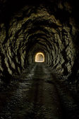 Sylwetka kobiety podnoszenie rąk z oślepiające światło na końcu tunelu. Koncepcja podboju przeciwności lub sukcesu przez przeszkody.