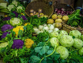 Marchew i ziemniaki w wiklinowym koszu na rynku rolników w Cornwall, england, Wielka Brytania