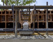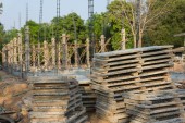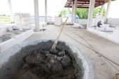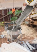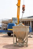 Wylewanie betonu na ziemi za pomocą żurawia z wiadra