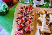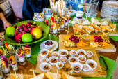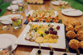 Stół do bufetu z hamburgerami, zimnymi przekąskami, mięsem i sałatkami