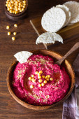 Zdjęcie "Palone buraków hummus w misce z ciecierzycy, nasiona sezamu i zdrowy układy drewnianych powierzchni. Koncepcja przekąsek" może być wykorzystywane do celów osobistych i komercyjnych zgodnie z warunkami zakupionej licencji Royalty-free. Obraz jest dostępny do pobrania w jakości wysokiej rozdzielczości do 5760x3840.