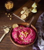 Palone buraków hummus w misce z ciecierzycy, nasiona sezamu i zdrowy układy drewnianych powierzchni. Koncepcja przekąsek