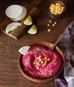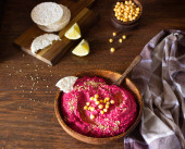 Zdjęcie "Palone buraków hummus w misce z ciecierzycy, nasiona sezamu i zdrowy układy drewnianych powierzchni. Koncepcja przekąsek" może być wykorzystywane do celów osobistych i komercyjnych zgodnie z warunkami zakupionej licencji Royalty-free. Obraz jest dostępny do pobrania w jakości wysokiej rozdzielczości do 5760x3840.