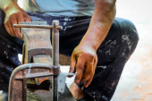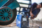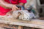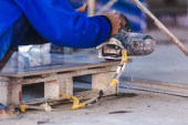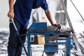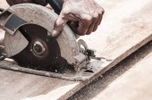 Człowiek profesjonalny pracownik rozbioru sąsiadująco z piły elektryczne budowlane wnętrz.