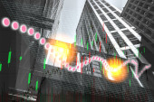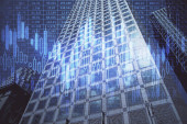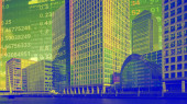 London docklands z danych i programowania informacje mapowane na każdej ze ścian budynku na komputerze