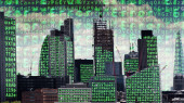 Tokyo city skyline sceny z danych i programowania informacje mapowane na każdej ze ścian budynku na komputerze