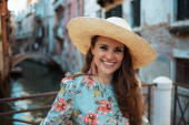 Brunetka Kobieta w czerwonej jedwabnej sukni pozowanie na balkonie nad kanałem most i gondoli