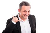 Portret firmy man wskazujące aparat i uśmiechnięty, izolowana na białym tle